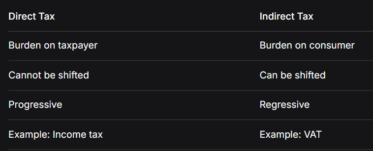 - Indirect Tax: Tax collected through goods/services (VAT)