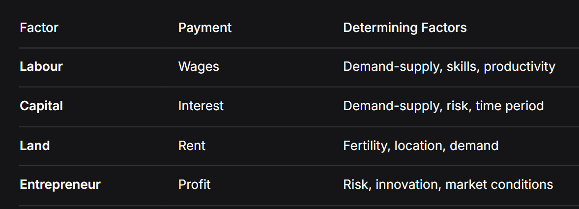 Factor Pricing refers to the determination of prices/remuneration for factors of production: