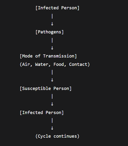 - Communicable diseases cycle: Infected person → Pathogens → Mode of transmission → Susceptible person → New infection