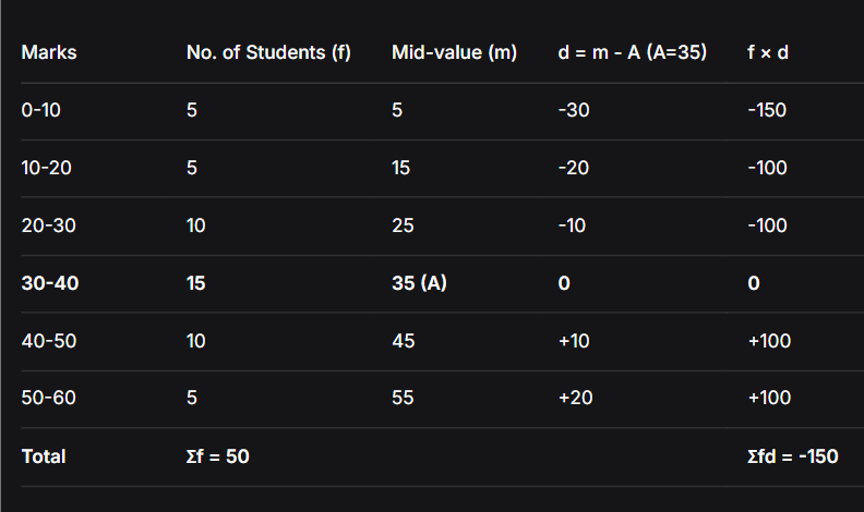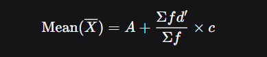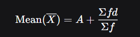 where AA = Assumed Mean (usually the mid-value of the class with highest frequency), d=m−Ad=m−A.