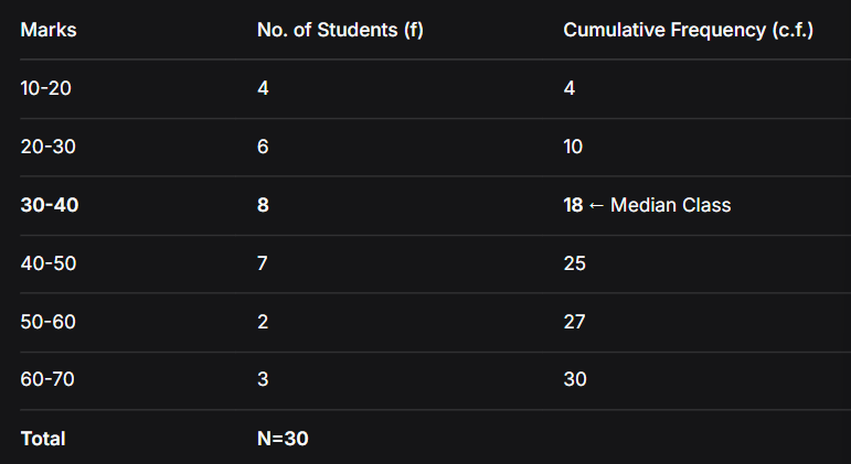 Here, N2=302=152N=230=15. The 15th item lies in the class 30-40 (c.f. reaches 18).