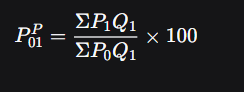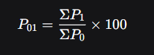 where P1 = Price in current year, P0 = Price in base year, P01 = Price Index.