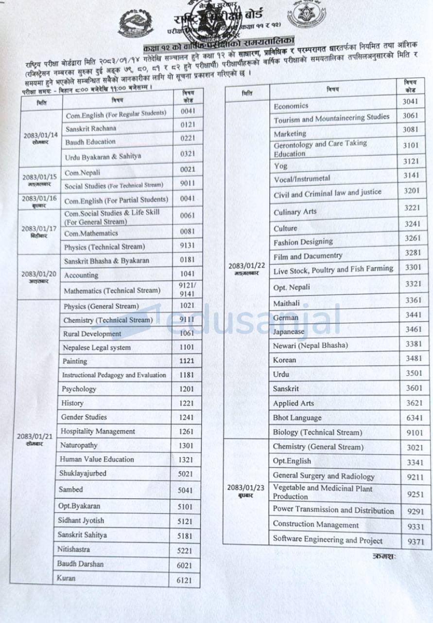 The examinations will begin on Baishakh 14, 2083 and conclude on Baishakh 27, 2083.