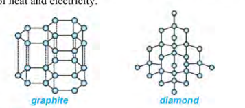 In graphite, three valence electrons form bonds and one electron remains free, making graphite a good conductor of heat and electricity. In diamond, all four valence electrons form bonds, so it does not conduct heat or electricity.