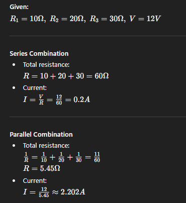 If resistors of 10 2, 20 2 and 30resistance are connected with a 12 V battery at first in series combination and then in parallel combination. Calculate the current in both cases and compare these values. Science and Technology, Grade 9 183 According to the given question, Resistance of the first resistor (R1) =10 Resistance of the second resistor (R2) = 20 Ω Resistance of the third resistor (R3) = 30 Potential difference (V) = 12 V