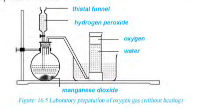 B. Without heating: 2H₂O₂ → 2H₂O + O₂ ↑ (catalyst MnO₂)