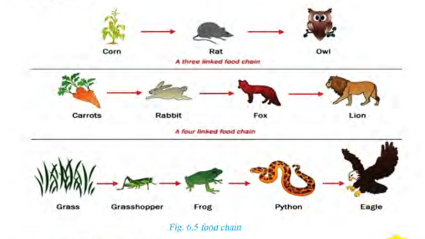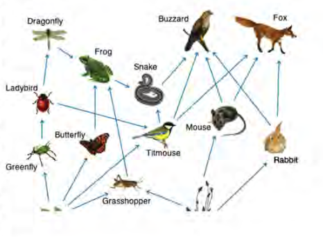 A food chain shows the linear transfer of energy from producer to top consumer.