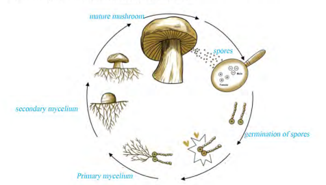 Spores germinate in favorable conditions → form primary mycelium (one nucleus).