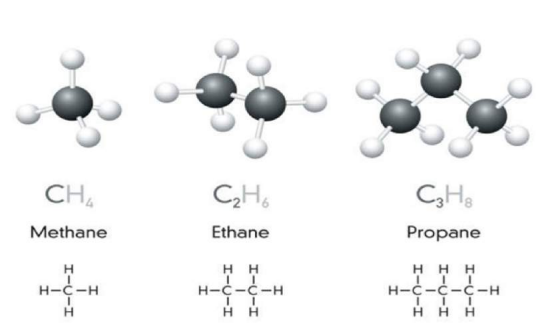 Examples of hydrocarbons: Methane (CH₄), Ethane (C₂H₆), Propane (C₃H₈).