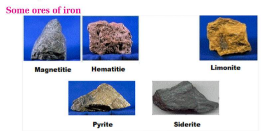 Iron ores: Hematite (Fe₂O₃ – chief ore), Magnetite (Fe₃O₄), Limonite (2Fe₂O₃·3H₂O), Siderite (FeCO₃), Pyrite (FeS)